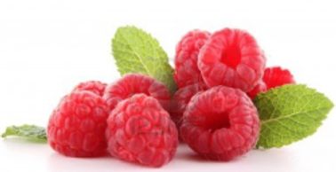 An edible soft fruit related to the blackberry, consisting of a cluster of reddish-pink drupelets.
