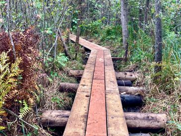 We tallied 90 volunteer hours to haul materials to the job site, dismantle the existing boardwalk, move and lay logs and planks, level the boardwalk, and put in hundreds of screws!